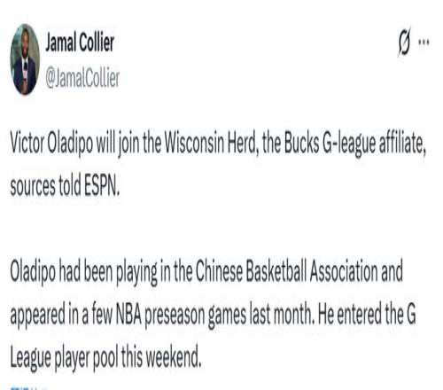 北京时间11月10日,据ESPN记者科利尔报道,两届全明星后卫奥拉迪波即将加入雄鹿队的发展联盟附属球队——威斯康星鹿群队。