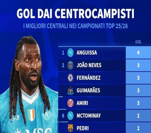 北京时间10月29日,德转统计出了本赛季至今欧洲五大联赛中场球员的进球榜,近两轮意甲连续得分的安古伊萨以4球排名第一,若昂-内维斯、恩佐-费尔南德斯、布鲁诺-吉马良斯以及阿米
